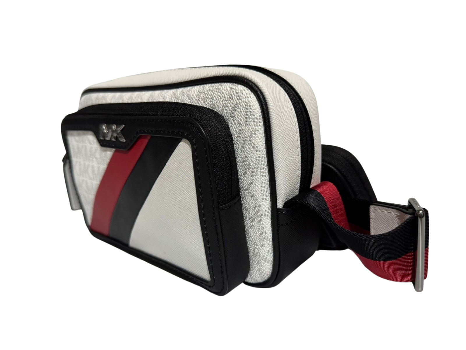 The Michael Kors Rivington Striped Logo Camera Bag in White and Bright Red features a distinctive striped logo design, crafted with premium materials for durability and style. Its compact shape offers practical storage for essentials, while an adjustable strap ensures comfortable, hands-free wear. Combining expert craftsmanship with modern aesthetics, this bag is ideal for those seeking a refined accessory that enhances both casual and elegant outfits.